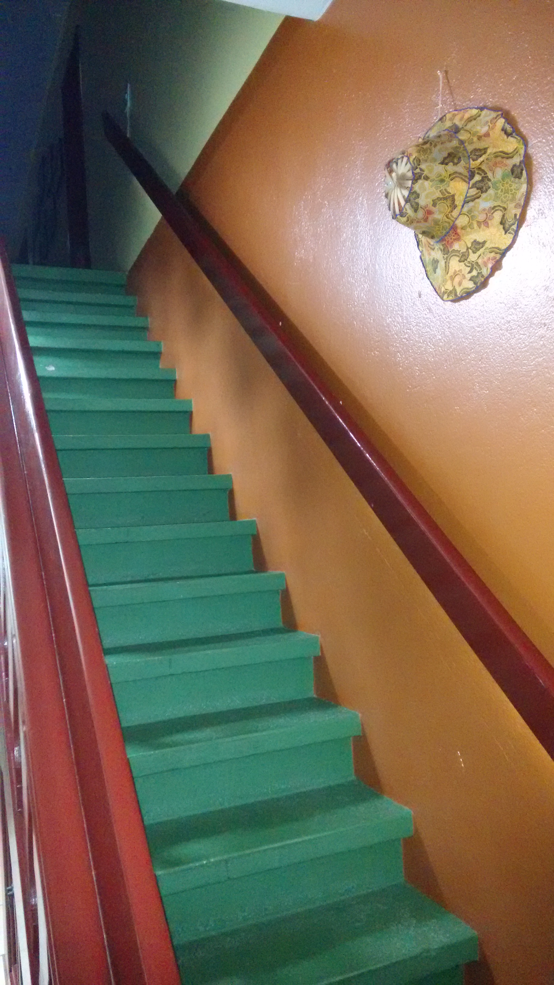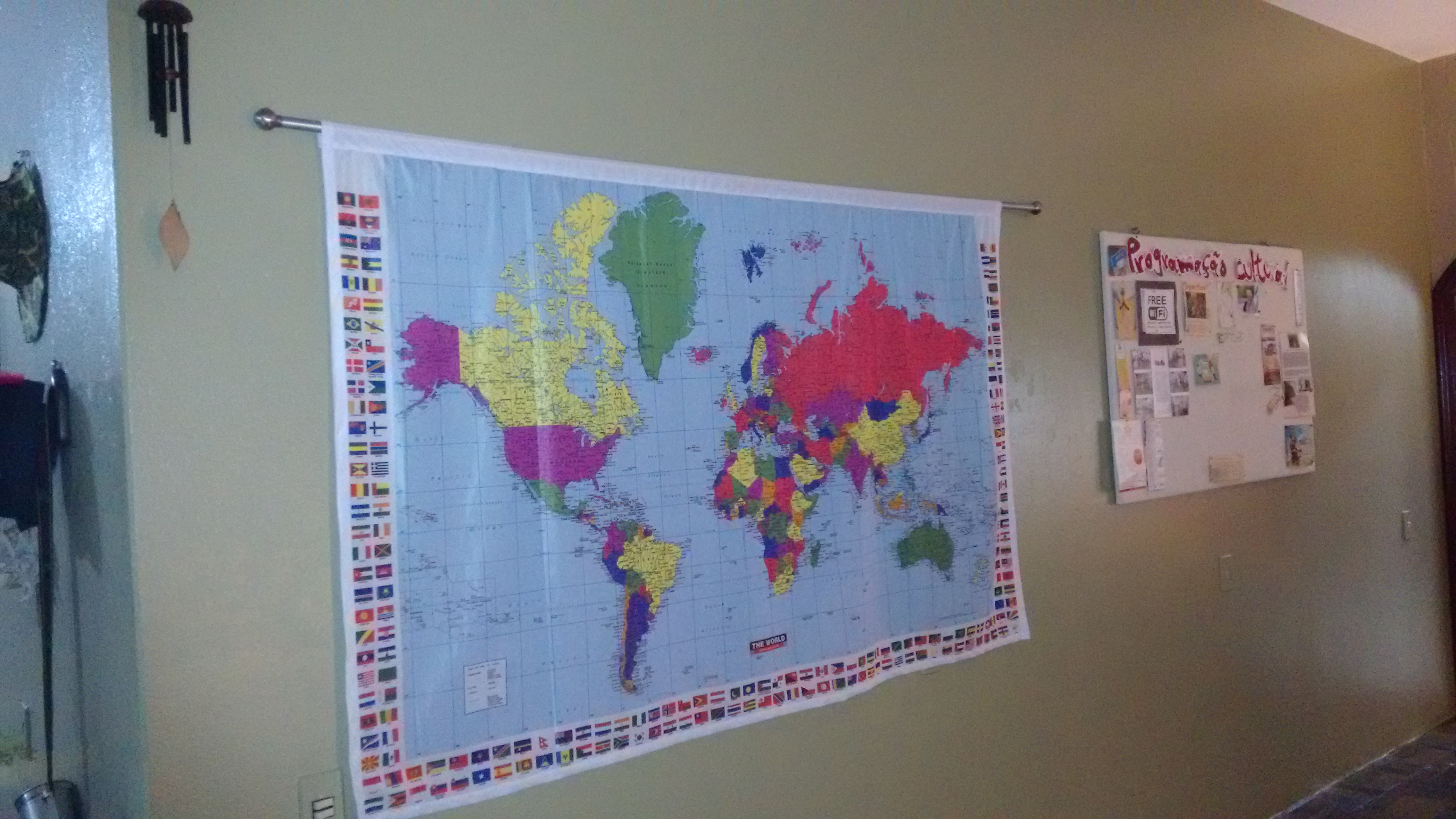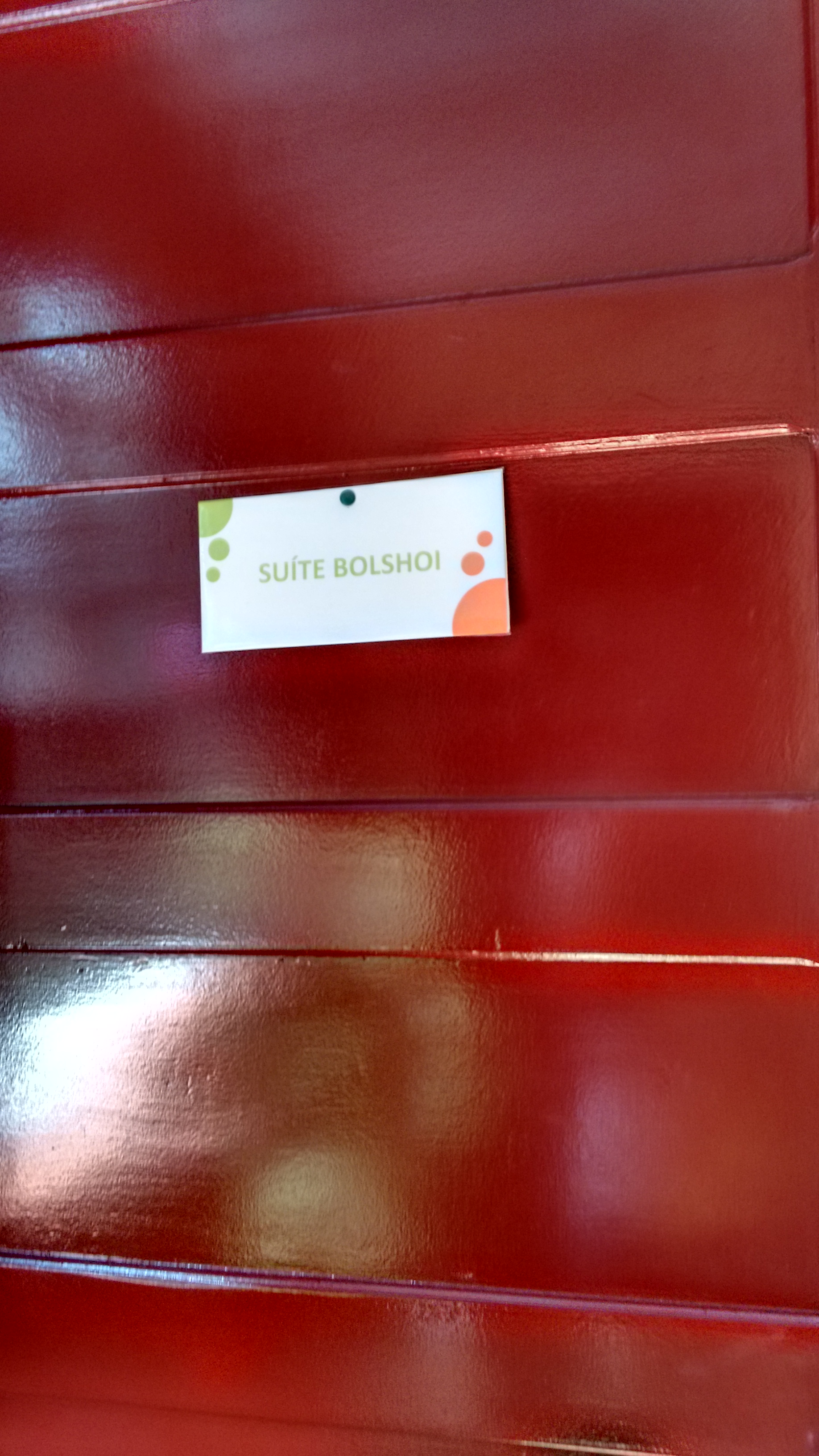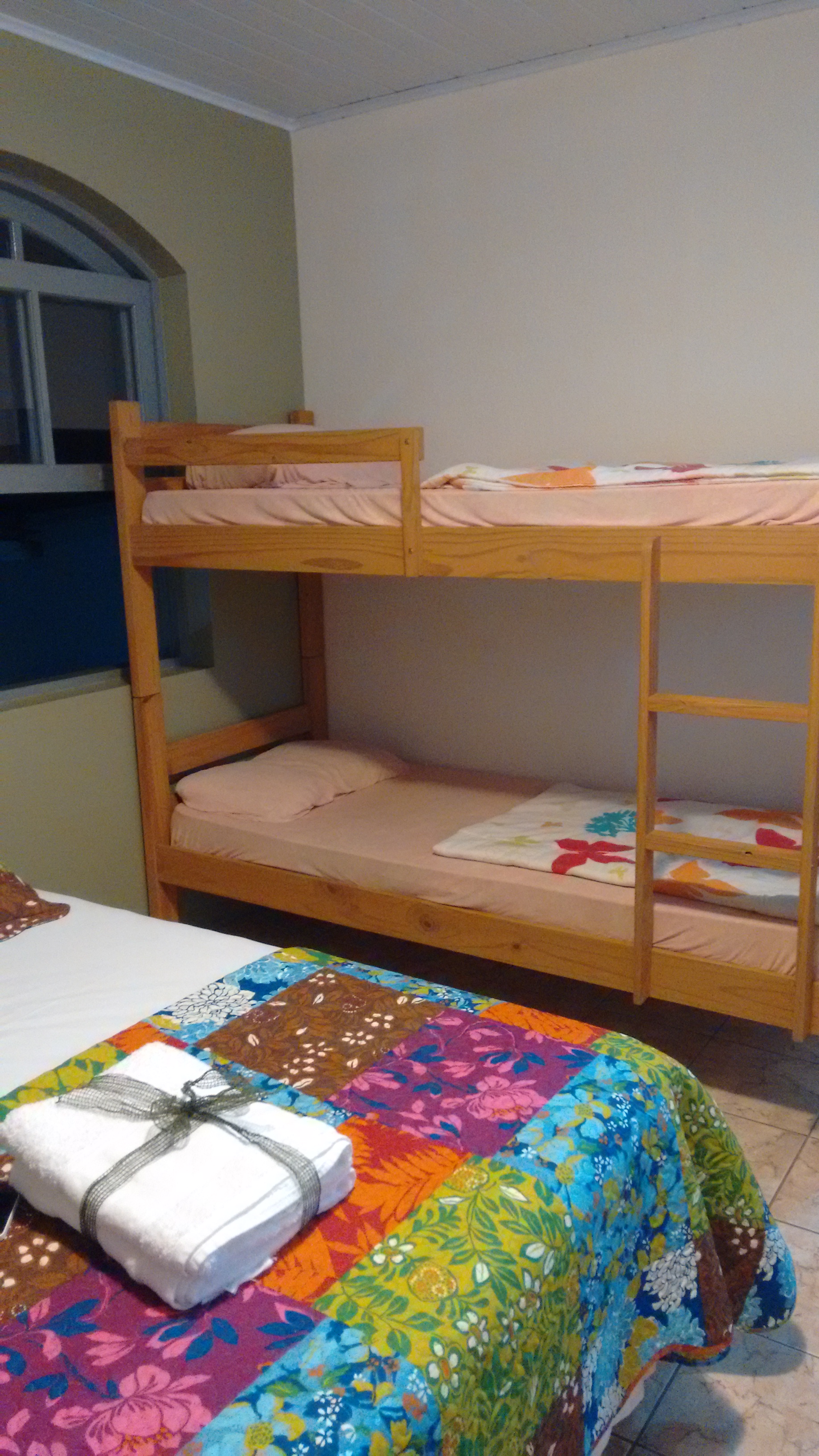 No piso superior estão os outros quartos e as suítes. As opções de acomodações são: quarto privativo com banheiro compartilhado, quartos coletivos femininos e masculinos, com banheiro compartilhado e suíte casal com banheiro. Eu reservei uma suíte casal, a Suíte Bolshoi!! Que é bem grande e podem ficar até quatro pessoas, por que tem uma cama de casal e mais um beliche. Achei muito confortável e tudo muito limpo. A roupa de cama e banho estavam cheirosas! Na suíte ainda tem ar condicionado, uma TV com alguns canais a cabo, mesinha para trabalhar e um pequeno armário para guardar os pertences. Ahh mas leve seus “produtos de toucador” por que eles não oferecem amenities.