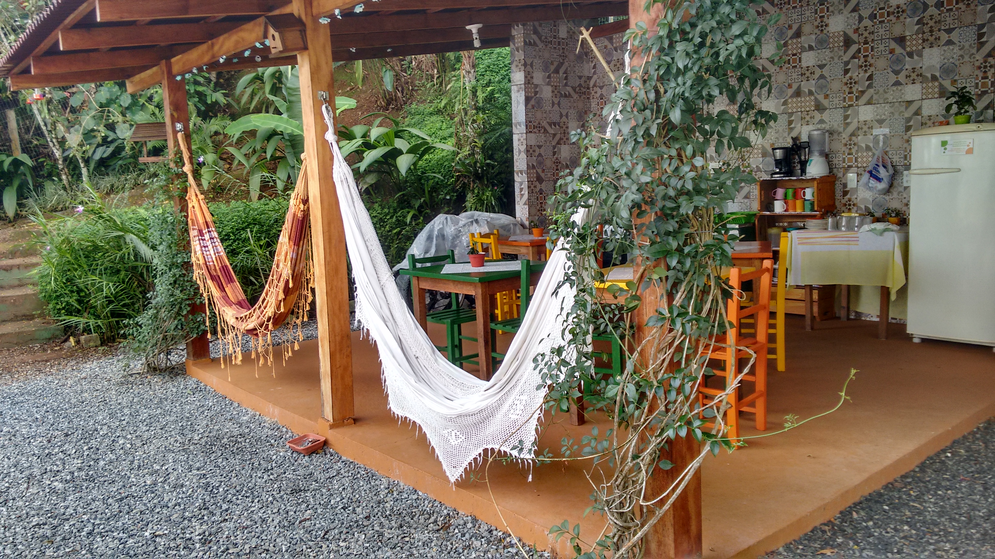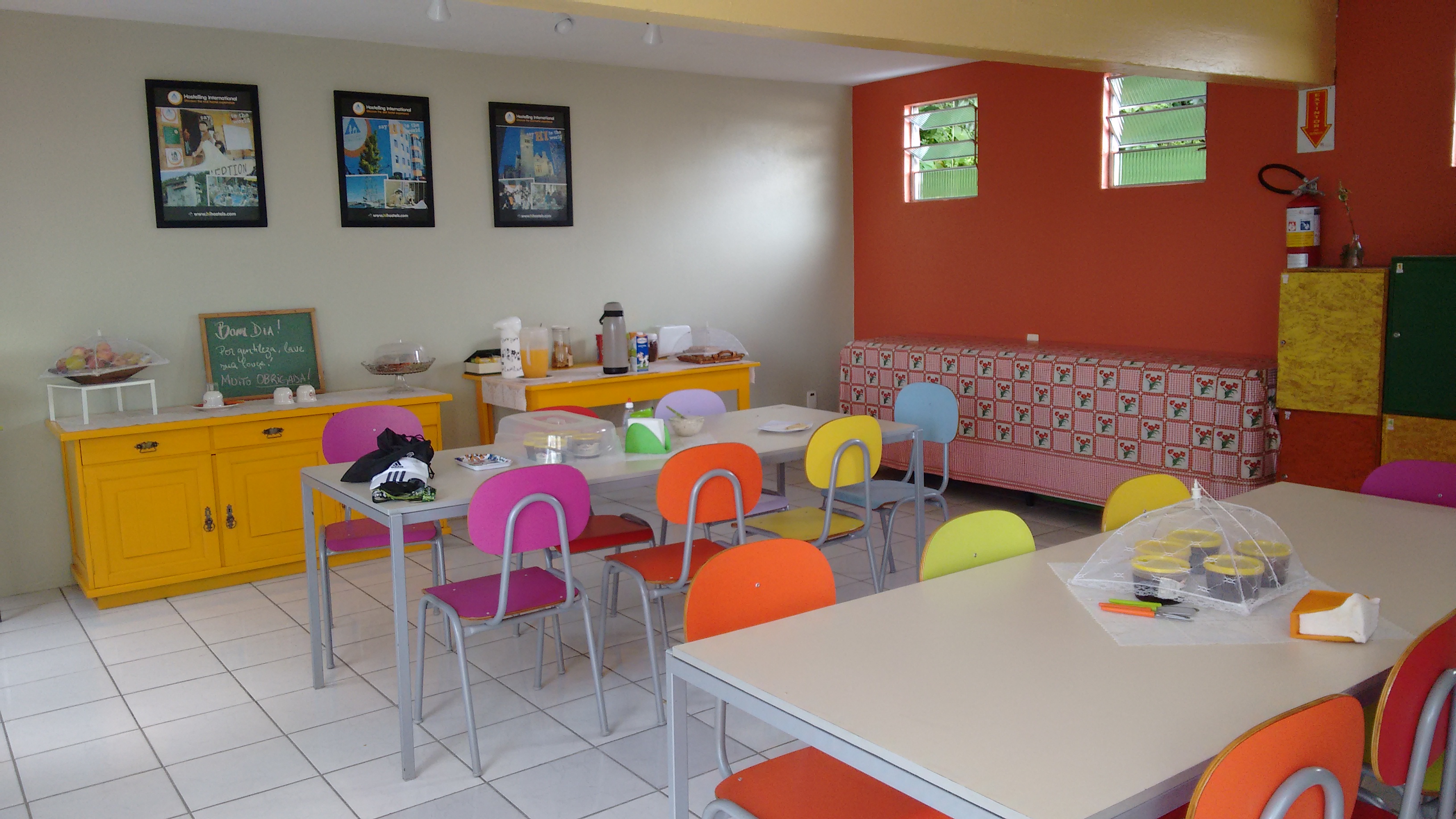 O café da manhã é servido normalmente a partir das 07h, mas como quase todos os hóspedes iam para a corrida, ele foi servido às 06h15. Achei super gentil da parte deles isso. São pequenos detalhes que fazem a diferença. O café é simples, mas tem o básico necessário, tudo pensando também no “não desperdício”. Primeiro passo é pegar a bandeja na cozinha, com o pão e os frios, depois vamos para a sala do café, onde tem café, leite, suco, bolos, frutas, manteiga e geleia. Depois de terminado seu desjejum, cada um lava, seca e guarda o que utilizou. E para quem quiser preparar suas refeições, tem uma cozinha equipa a disposição. Nas fotos dá pra sentir um pouco do astral do lugar.