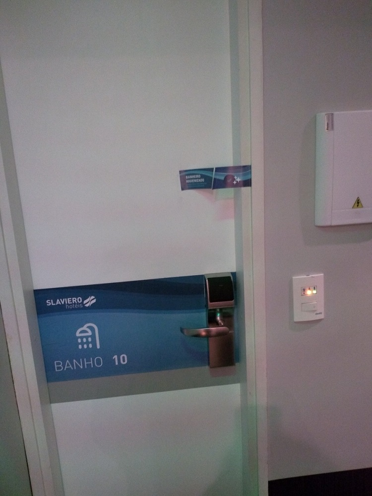 Hora do banho!!! São vários banheiros em um corredor! Os que estão prontos para uso ficam “lacrados” com adesivo, indicando assim que foi limpo. Os amenities, shampoo e sabonete líquido, ficam em dispensers dentro do box, é só usar. O cheirinho é bem bom, assim como o chuveiro. Água quentinha e bem servida.
