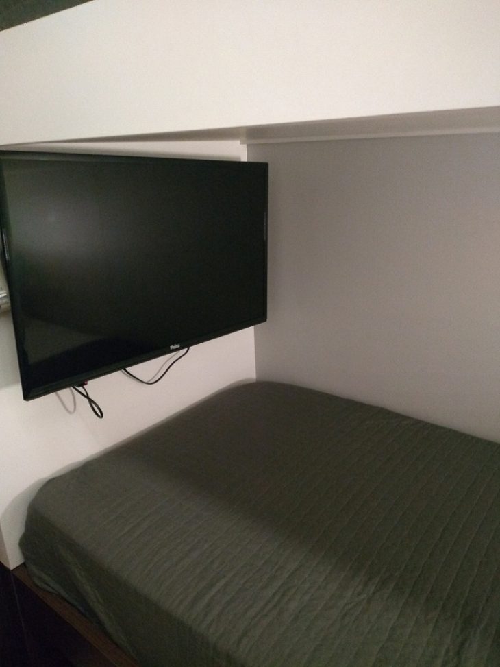 Fiquei sozinha! Mas antes perguntei se eu teria de dividir o quarto com alguém e a moça da recepção falou que não. Meu quarto tinha o beliche, em cada cama uma TV com canais a cabo, telefone, um aparador para descanso de mala, WiFi, ar condicionado e água cortesia.