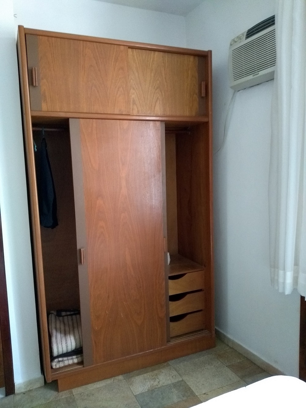 Tem bancada para colocar as tranqueiras todas ahahah. TV com alguns canais a cabo, frigobar com água e refrigerante, ar condicionado e armário.